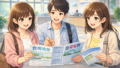 春休みの青空の下、地方の教習所前で笑顔で並ぶ大学生グループと自然豊かな校舎のイラスト 合宿免許|おすすめ・申込み