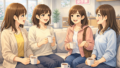 春の地方都市にある社会人向けの合宿免許教習所ラウンジで、スーツをカジュアルに着崩した20〜30代の社会人男女がノートPCを閉じてリラックスしている様子。窓から柔らかい自然光が差し込み、落ち着いた雰囲気と前向きな空気感が伝わる爽やかな色味のリアル系イラスト。 合宿免許|おすすめ・申込み